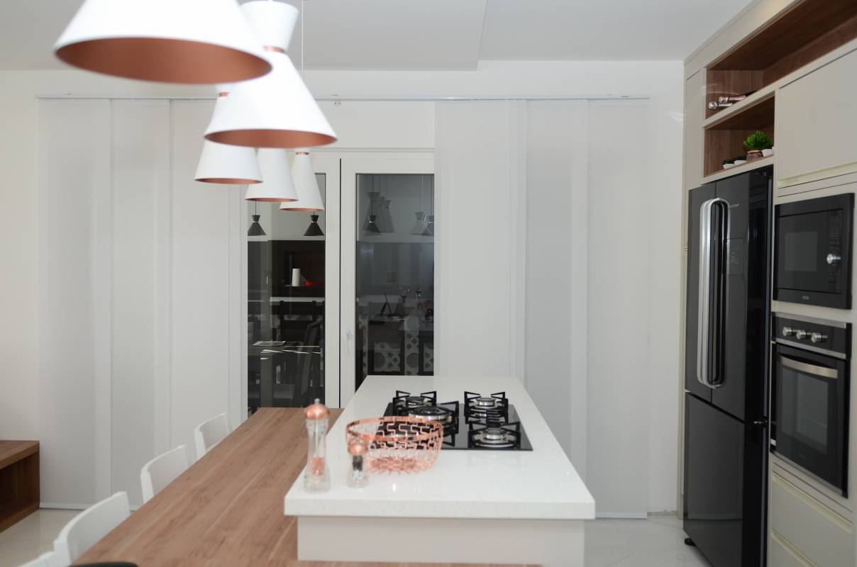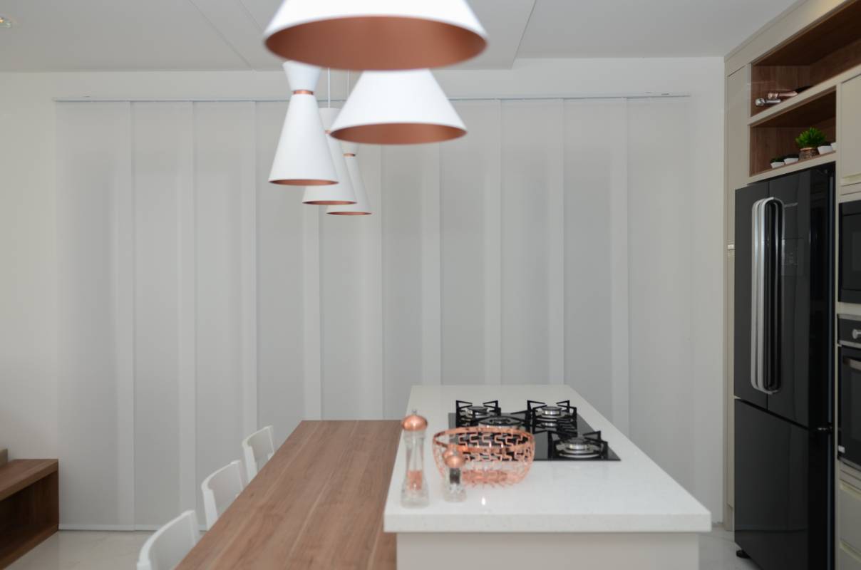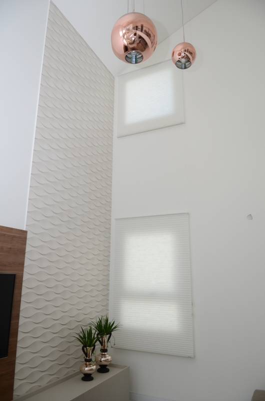 Por se tratar de grandes janelas voltadas ao sol,e a movimentação da rua tivemos a preocupação na escolha por cortinas especiais, aliando a beleza , leveza e tecnologia de tecidos com alto fator de retenção térmica.